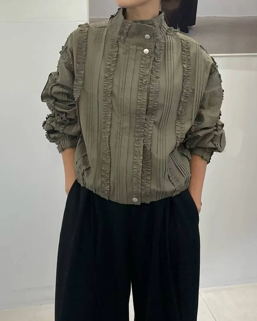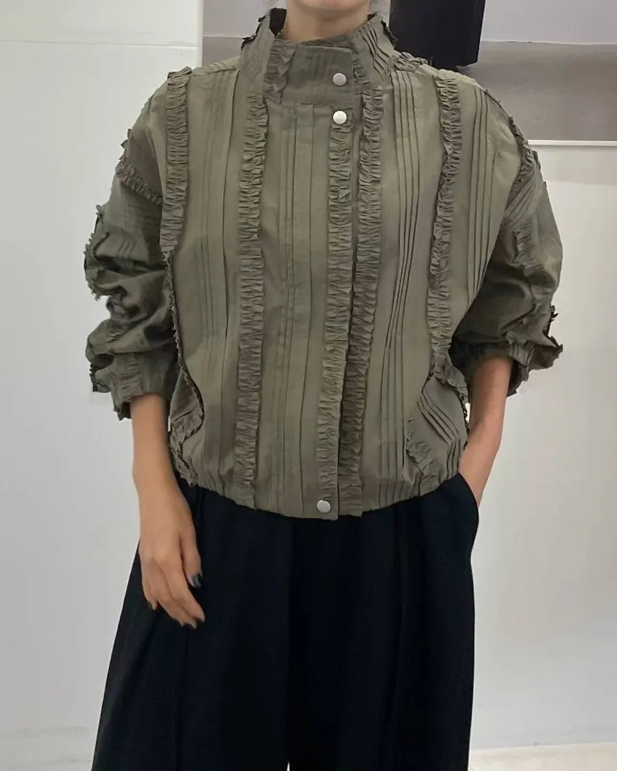 微挺的材質讓版型立起來,領口可立可折,穿出率性又俐落的造型。